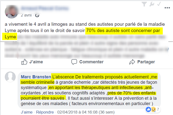 J’ai fait un signalement de ses ordonnances pour l’autisme au Conseil National de l’Ordre des Médecins en 2017 qui s’est auto-saisi. Une procédure a eu lieu, où il a pu désigner comme médecin expert un autre médecin Chronimed. Il avait le soutien de plusieurs associations Lyme, ainsi que celui d’une influente société internationale, l’ILADS. Une pétition avait récolté 110.000 signatures. La Fédération Française de Lutte contre les maladies vectorielles à tiques a annoncé qu’il a été totalement blanchi par le Conseil National de l’Ordre des médecins. Une autre procédure a été déclenchée en 2022 sans aucun rapport avec l’autisme5.
